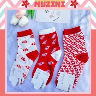 Tất nữ Muzinu tất cổ cao họa tiết chữ tone đỏ rực rỡ sắc màu TN223