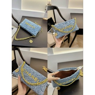 túi đeo chéo xanh jean hoa trà classic xích vàng đồng xu 24cm