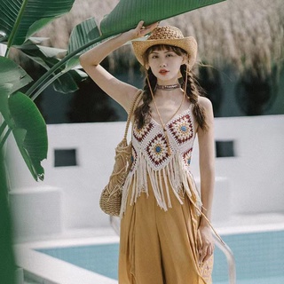 Áo không tay JSC dệt kim khoét rỗng phối tua rua phong cách dân tộc Thái Lan cho nữ