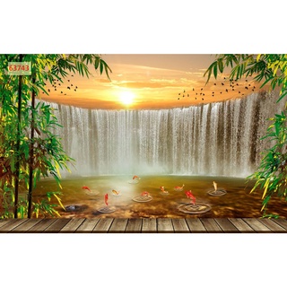 Tranh 3d dán tường chủ đề cá chép cá koi hồ sen thác nước