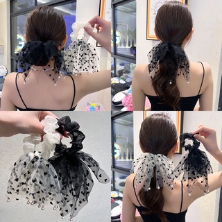 Dây Cột Tóc Vải Lưới Họa Tiết Chấm Bi Phối Tua Rua Và Ngọc Trai Xinh Xắn