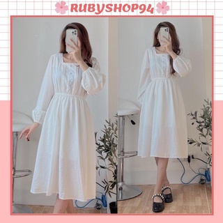 Váy đầm babydoll trắng tiểu thư dài tay dáng xòe vải thô đũi cổ ren xinh xắn