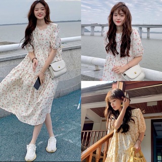 Váy Hoa ulzzang dáng dài cúc bọc voan tơ Quảng Châu Đầm hoa nhí vintage dáng dài