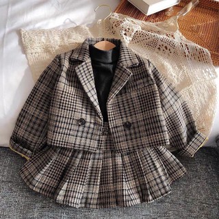 [SALE] Set Váy Xếp Ly/Quần Baggy Phối Áo Dạ Kẻ Cổ Vest Cực Dễ Thương Cho Bé Trai/Gái V162