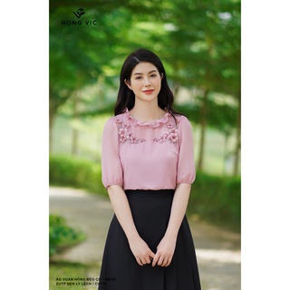 Áo nữ thiết kế Hong Vic cotton hồng đính hoa SM407