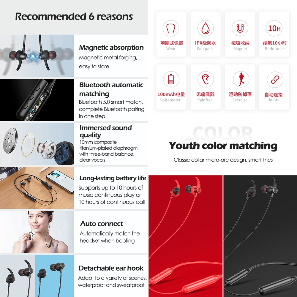 Đặc điểm: 1, 【Chức năng từ tính mạnh mẽ】 Hiệu ứng từ mạnh mẽ, khi bạn không phát nhạc, bạn có thể hấp thụ từ tính nano treo trên cổ, như đồ trang sức, lưu trữ di động 2, 【Thiết kế dây đeo cổ hình chữ U】 Có thể ngăn ngừa mất tai nghe hiệu quả trong khi tập thể dục 3, 【Chống thấm nước IPX5】 Cho dù đó là mồ hôi khi tập thể thao hay mưa, bạn đều có thể đối phó được và để âm nhạc đi cùng bạn. 4, 【Hiển thị thời gian thực cung cấp năng lượng cho tai nghe】 Hỗ trợ hệ thống iOS và một số nguồn cung cấp hệ thống Android 5, 【Chip Bluetooth 5.0】 Các chip không chậm trễ, công suất thấp, hiệu năng cao giúp cải thiện đáng kể hiệu năng cuộc gọi, tính tương thích, tính năng và hơn thế nữa, mang lại cho bạn trải nghiệm Bluetooth độ nét cao hơn 6, 【Tự động khớp】 Siêu tiện lợi, có thể tự động khớp với tai nghe khi khởi động 7, 【Âm bass gây sốc】 Màng loa, loa siêu trầm và chất lượng âm thanh độ trung thực cao