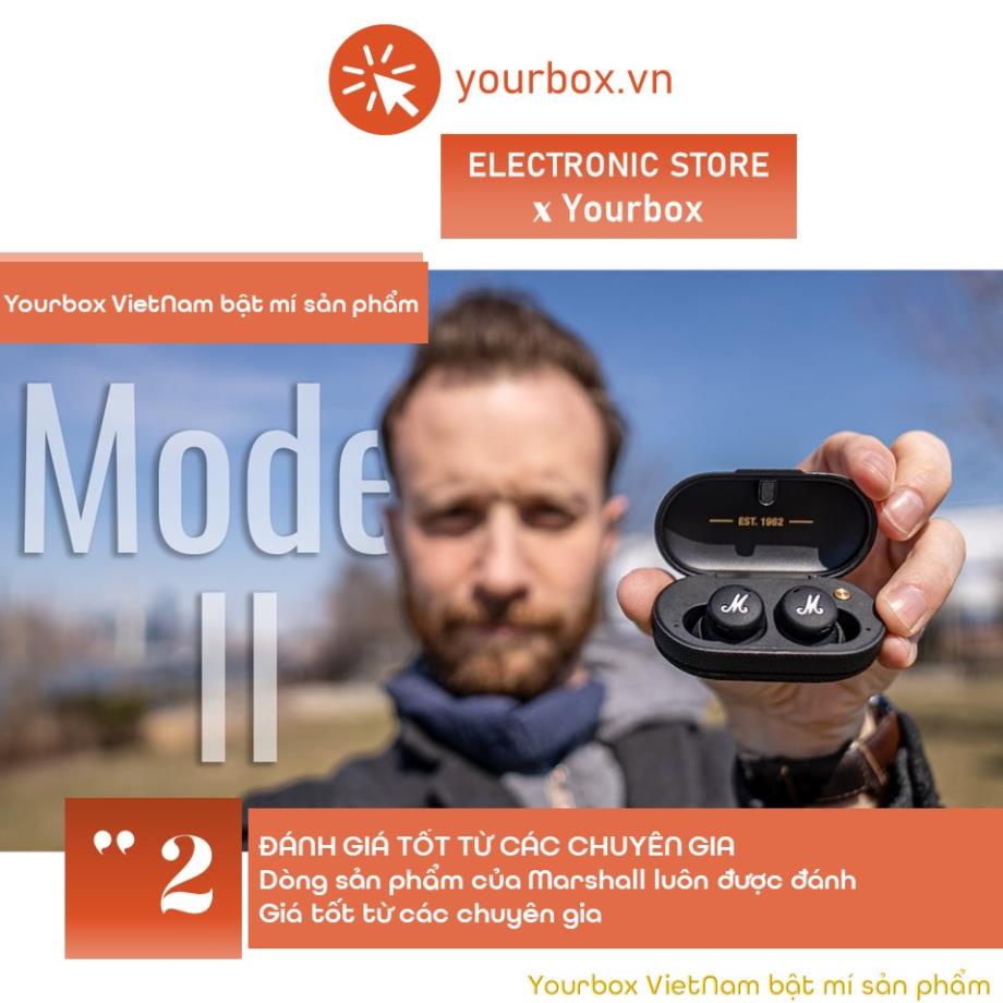 Đặc điểm nổi bật của Tai nghe Bluetooth nhét tai thể thao không dây Marshall Mode II (2), kết nối Bluetooth chống ồn: - Được trang bị công nghệ Bluetooth 5.0, tai nghe cảm ứng nhạy với áp suất rất trực quan và dễ sử dụng. - Cấu trúc công thái học mang lại trải nghiệm đeo thoải mái và thoải mái. Nút tai đi kèm có bốn kích cỡ khác nhau để vừa vặn an toàn. - Xếp hạng chống thấm nước IPX4 giúp tai nghe bền ngay cả sau khi tiếp xúc với nước. - Hộp sạc có thể sạc Chế độ II lên đến bốn lần tuổi thọ pin lên đến 5 giờ. Khi cần sạc tai nghe, chỉ cần cho chúng vào hộp sạc và chúng có thể được sạc Tính phí trong túi. - Thiết kế chia hai tai cho phép sử dụng riêng một tai, tương đương với hai tai nghe Bluetooth độc lập.