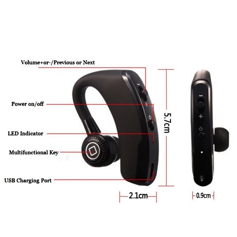 Tai nghe bluetooth V9 không dây 1 bên có kèm micro tạo âm thanh nổi có thể dùng cho điện thoại Samsung IPhone Xiaomi ======================== Loại tai nghe: bluetooth không dây Loại phích cắm: Không dây Chức năng: Dành cho điện thoại di động, cho trò chơi video, tai nghe màn hình, tai nghe HiFi, cho iPod, thể thao, tai nghe thông thường Tính năng không thấm nước: Không Cách truyền âm: Không dây Cách tiếng ồn: Có Hỗ trợ thẻ nhớ: Không Hỗ trợ không dây: Có Hỗ trợ APP: Không Phong cách: Móc tai Nguyên tắc truyền âm: truyền thống Dải tần khả dụng: 8-25000Hz Mã sản phẩm: tai nghe bluetooth v9 Độ dài dây: Không có Tên thương hiệu: Vitog Micro: Có Kết nối: USB Hỗ trợ Apt-x: Không Độ nhạy âm: 123dB Điều khiển âm lượng: Có Trở kháng: 50 Nút điều khiển: Có