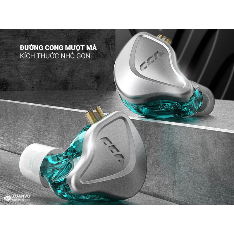 Phần vỏ của tai nghe được làm bằng nhựa acrylic trong suốt (màu xanh lam) cho phép bạn nhìn rõ trình điều khiển EST + Dynamic bên trong. Bề mặt faceplate sử dụng hợp kim nhôm, phủ lớp hoàn thiện mờ mịn mang đến cảm giác cao cấp vượt tầm giá. Để giảm bớt sự đơn điệu, nhà sản xuất đã khắc lên tai nghe logo CCA cùng đường viền nổi bật.