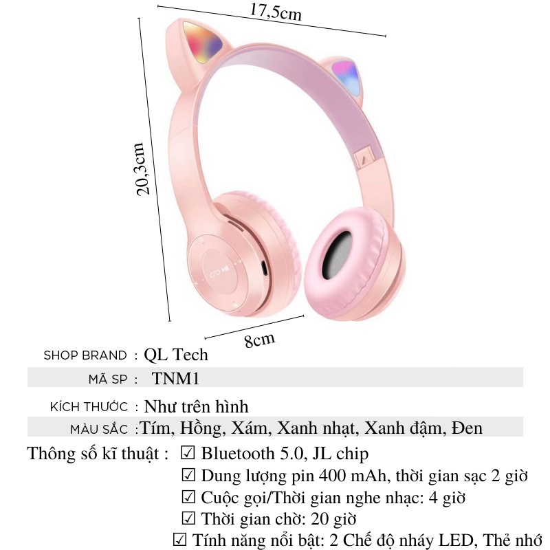 👉THÔNG SỐ KĨ THUÂT: Tai Nghe Mèo Chụp Tai Bluetooth ✅ Bluetooth 5.0, JL chip ✅Dung lượng pin 400 mAh, thời gian sạc 2 giờ ✅ Cuộc gọi/Thời gian nghe nhạc: 4 giờ ✅ Thời gian chờ: 20 giờ ✅ Đường kính loa: 40mm ✅ Kích thước: 203*175*80mm; Trọng Lượng: 182g ✅ Tính năng nổi bật: 2 Chế độ nháy LED, Thẻ nhớ ✅ Bộ sản phẩm : Tai nghe + Cáp sạc micro USB