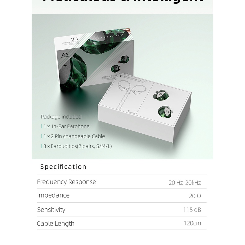 1. Thương hiệu: Lafitear 2. Mô hình: LF1 3. Loại tai nghe: In-ear 4. Trở kháng: 20Ω 5. Độ nhạy tai nghe: 115dB 6. Dải tần số: 20-20000Hz 7. Giao diện phích cắm: 3,5 mm 8. Loại phích cắm: Loại đường dây 9. Chiều dài cáp: 1,2m 10. Cho dù với micrô: Tùy chọn 11. Kiểm soát âm lượng: Không 12. Cho dù với cáp: Cáp nâng cấp mạ bạc có thể tháo rời