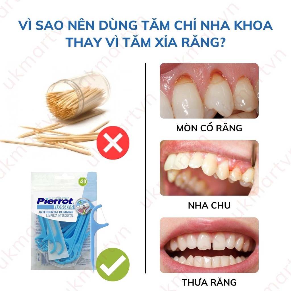 Tăm Chỉ Kẽ Răng Pierrot Flossers Gói 30 Cái/ Tây Ban Nha + Mô tả: -Tăm chỉ Pierrot kết hợp tăm nha và chỉ nha trên 1 sản phẩm, vừa lấy mảng bám trong kẽ răng vừa lấy được thức ăn thừa dính ở khe răng, góc hàm. - Chỉ kẽ răng Pierrot FIossers với sợi chỉ chuyên biệt, tiệt trùng, giúp bạn loại bỏ dễ dàng các thức ăn thừa ở các kẽ răng, phòng ngừa bệnh nha chu, hôi miệng. Sản phẩm được thiết kế tiện lợi, một đầu dùng như chỉ nha khoa, một đầu dùng như tăm xỉa răng. Thiết kế độc đáo với tay cầm từ nhựa cao cấp, an toàn khi sử dụng. - Chỉ kẽ răng giúp bạn loại bỏ dễ dàng và hiệu quả việc làm sạch các thức ăn thừa bám dính trên răng, làm sạch khoang miệng. Sản phẩm có một đầu dùng như chỉ nha khoa, một đầu dùng như tăm xỉa răng. - Chỉ kẽ răng Pierrot FIossers đem lại hiệu quả tốt hơn nhiều so với việc sử dụng sợi chỉ nha khoa trong việc làm sạch các khoảng trống giữa răng. - Sợi chỉ mềm mịn - Thiết kế nhỏ gọn, dễ sử dụng, tiện lợi mang theo khi đi du lịch.