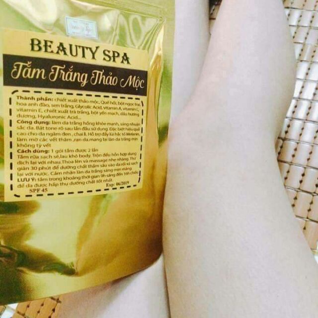 TẮM TRẮNG THẢO MỘC BEAUTY SPA với thành hoàn toàn từ các loại thảo mộc giúp cho da trắng hồng nhanh chóng. Tắm trắng sẽ giúp bạn hỗ trợ được những bụi bẩn các tạp chất từ ngoài môi trường bám vào da làm da bị xỉn màu. Thành phần thảo mộc còn giúp bạn làm mờ được những khuyết điểm trên da một cách hiệu quả cho làn da trắng đẹp không tỳ vết. Việc tắm trắng cũng rất đơn giản mà bạn có thể dễ dàng thực hiện ở nhà mà không người hỗ trợ bởi công thức cực kỳ đơn giản.