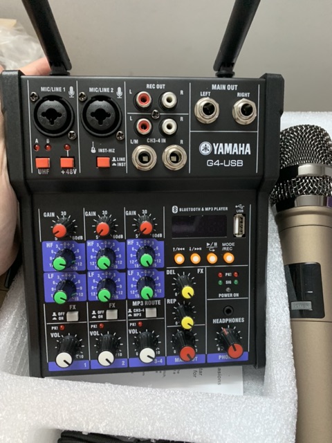 2. ƯU ĐIỂM MIXER G4 - Có 2 mic không dây tiện karaoke - Sử dụng nguồn 5V nên có thể sử dụng cho oto hoặc cho các mịc đich đi xa mà không cần dòng điện 220V - Thiết kế nhỏ gọn với nhiều kênh âm thanh, nhiều nút hiệu chỉnh như một bàn mixer thu âm trong các phòng thu chuyên nghiệp được thu nhỏ và rất dễ sử dụng. - Với nhiều đường mic vào có thể cắm micro thu âm 48v, micro 5v và micro karaoke gia đình có 2 kênh chỉnh âm thanh micro riêng. - Nhiều tính năng có thể sử dụng để kết nối với âm ly đấu với loa to hát karaoke gia đình , oto - Kết nối với điện thoại để phát livestream hoặc thu âm qua sợi dây kết nối livestream 3 màu - 4 kênh âm thanh đều có nhiều tùy chỉnh âm bass, âm trung, âm treble , echo, delay - Đặc biệt echo có độ vang dầy hay + với delay giúp giọng hát nghe hay hơn, micro hát nhẹ dễ hát hơn.