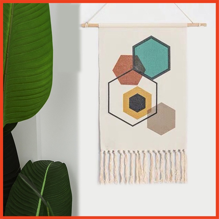 Nhà Cửa & Đời Sống > Trang trí nhà cửa > Trang trí tường > [Tặng kèm thanh gỗ, dây treo, đinh tàng hình] Thảm vải treo tường tua rua phong cách vintage, họa tiết lục giác mới lạ
