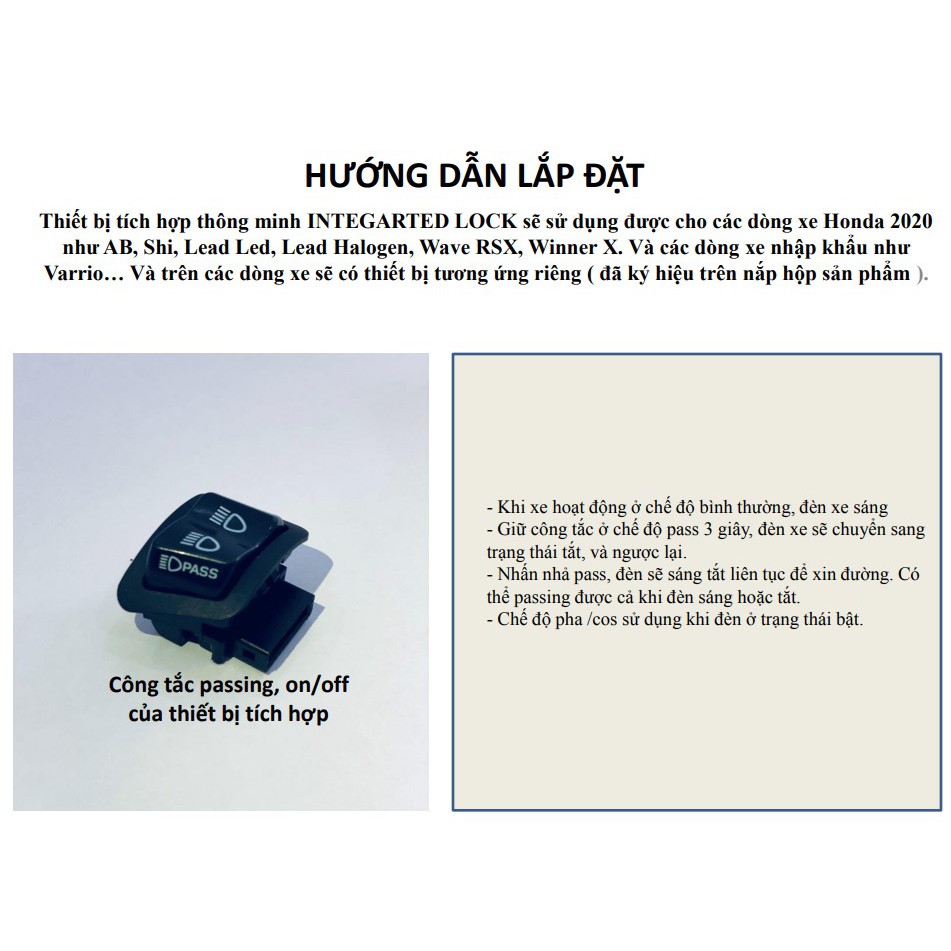 Các dòng xe mới của Honda Việt Nam đều bỏ công tắc tắt đèn, việc sử dụng đèn chiếu sáng ban ngày hiện nay ít được người tiêu dùng chấp nhận vì thói quen bao đời nay. NCPshop cung cấp giải pháp tắt đèn mới GIỮ NGUYÊN ZIN CỦA XE, không ảnh hưởng tới bảo hành xe - Bộ ngắt đèn INTEGRATED LOCK. (Xe Winner X cần thay công tắc passing khác)