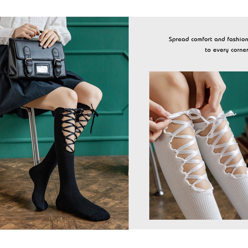 Giới thiệu Tất nữ cổ cao thắt dây cá tính phong cách Hàn Quốc màu đơn giản
