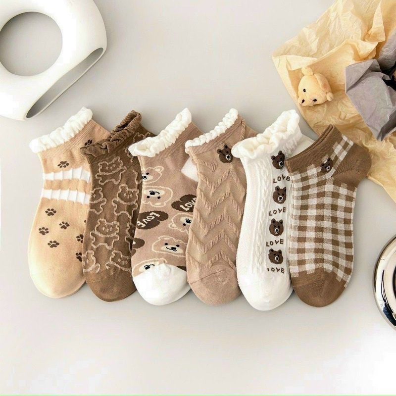 Set 6 đôi tất hình Gấu tone Nâu cổ ngắn nhún bèo xinh xắn 👉 TẤT NỮ chất liệu cotton tự nhiên đạt chứng nhận nguồn gốc an toàn, mềm mại, thấm hút mồ hôi tốt, giữ đôi chân luôn khô thoáng. Thiết kế vùng thoát khí tăng cường khả năng thoát mồ hôi, bổ sung công nghệ kháng khuẩn khử mùi mang lại cảm giác tự tin, thoải mái 👉Thiết kế tinh tế cực kỳ đáng yêu, trẻ trung, năng động và đặc biệt rất thời trang 👉Chun tất với công nghệ dệt kim tự động đảm bảo không bị nhão sau một thời gian sử dụng 👉Chất liệu vải mềm, tất mỏng nhẹ thoáng, co giãn 4 chiều 👉Đặc biệt sản phẩm rất dề phối đồ cho các bạn nữ. 👉Tất 4 mùa đều đi được mang lại cảm giác thoải mái