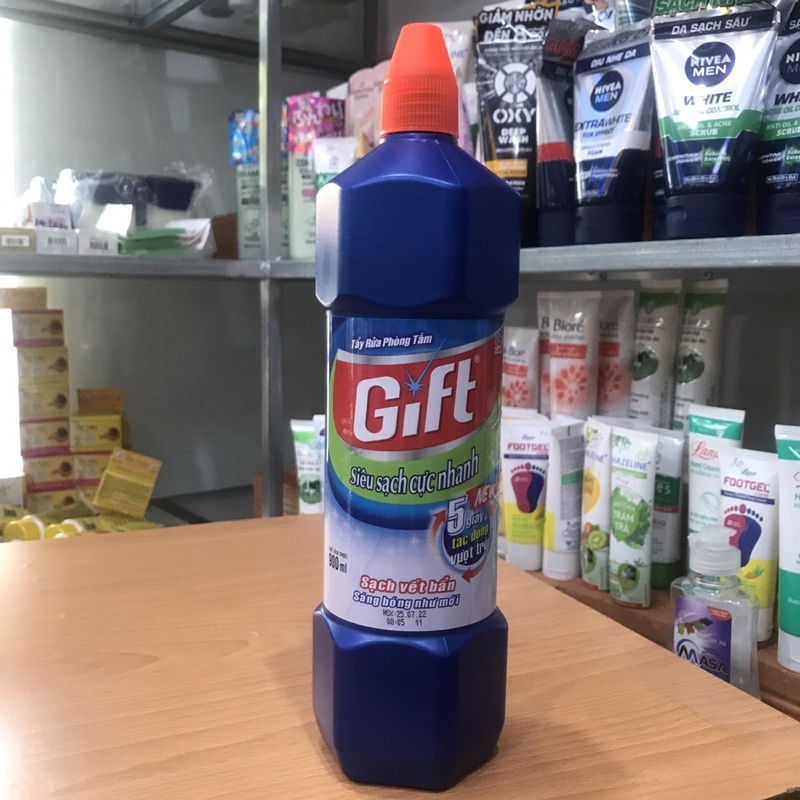 Nước tẩy rửa nhà tắm Gift là dòng sản phẩm tẩy bồn cầu, bồn tắm, sàn nhà tắm mang thương hiệu Gift phổ biến, đóng gói theo chai 900ml sử dụng phổ biến trong văn phòng chuyên nghiệp. Với công thức mới đậm đặc giúp diệt sạch các loại vi khuẩn gây bệnh và mảng bám ố vàng trên bồn cầu một cách nhanh chóng mà không phải tốn nhiều công sức cũng như thời gian để cọ rửa. Chỉ cần xịt Gift lên bề mặt cần vệ sinh sau đó dùng cọ chà sạch là có thể đánh bay vết bẩn, ố vàng bám lên các bề mặt. Chuyên gia diệt khuẩn hiệu quả, loại bỏ mùi hôi khó chịu mang lại môi trường trong lành, đảm bảo vệ sinh, an toàn cho người sử dụng, không gây kích ứng, bốc mùi khó chịu khi sử dụng hàng ngày. Với công thức đậm đặc nhưng không có quá nhiều chất tẩy màu, chất độc nằm trong danh mục cấm sử dụng. Hương thơm dịu mát mang lại cảm giác thông thoáng, sạch sẽ.