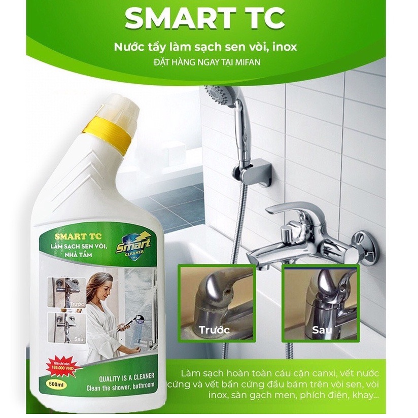 Giới thiệu Nước tẩy Smart TC rửa cặn Canxi làm sạch vết nước vết ố trên INOX , VÒI SEN chai 300/500ml - Dung dịch tẩy SMART CLEANER