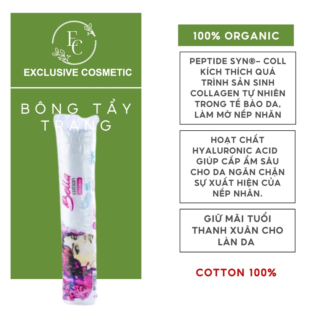 Sản phẩm: – Bông Tẩy Trang Bella Cotton Premium được làm từ 100% cotton nguyên chất, rất mềm và mịn không bao giờ bị dính bông trên mặt.