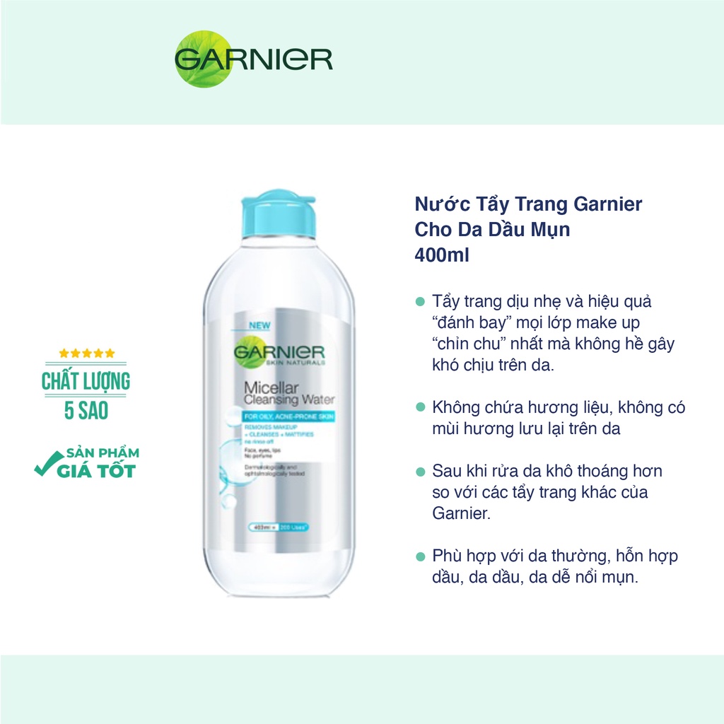 - Dành cho da dầu mụn(màu xanh dương): Nước làm sạch và tẩy trang đa năng Garnier Micellar Water For Oily & Acne-Prone Skin 400ml nhẹ nhàng làm sach da, lấy đi bụi bẩn, cặn trang điểm và dầu thừa gây ra tình trạng mụn. Phù hợp cho da dầu & da hỗn hợp. Không có cồn & hương liệu. Lấy đi dầu thừa mà không gây khô da. Sử dụng công nghệ Micelles (Micellar Technology), phân tử Micelles lấy đi bụi bẩn sâu bên trong lỗ chân lông theo cơ chế hoạt động của nam châm khi lau nhẹ trên da mà không cần chà xát.