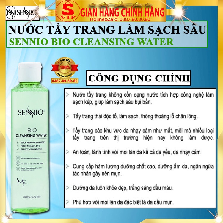 *** ĐẶC ĐIỂM NỔI BẬT NƯỚC TẨY TRANG SENNIO HÀN QUỐC LÀM SẠCH SÂU KHÔNG CỒN LOẠI TỐT CHÍNH HÃNG *** 1* Nước tẩy trang không cồn Sennio tích hợp công nghệ làm sạch kép. Giúp tẩy trang tất cả các lớp trang điểm, bụi nhỏ liti từ sâu trong da. 2* Nước tẩy trang tốt Sennio hàn quốc không những tẩy trang vùng mặt mà còn dùng tẩy trang được cho cả mắt và môi mà các nước tẩy trang thông thường không làm được. 3* Nước tẩy trang Bio xanh Sennio giúp tẩy trang, thải độc tố, cân bằng độ PH và dưỡng da trắng hồng tự nhiên. 4* Nước tẩy trang hàn quốc Sennio không gây khô da, không chứa cồn hay chất tẩy trắng làm hại đến da. 5* Làm sạch sâu, không gây bí tắc và làm se khít lỗ chân lông cực tốt. 6* Nước tẩy trang chính hãng Sennio loại bỏ và ngăn ngừa mụn rất tốt. 7* Với thành phần thiên nhiên nên an toàn với mọi loại da. Kể cả da nhạy cảm nhất. Bà bầu dùng thởi mái. 8* Phù hợp với mọi loại da như: Da nhạy cảm, da khô, da nhờn, da hỗn hợp thiên dầu, da dầu mụn, da thường. 9* Nước tẩy trang Bio Sennio chính hãng được bộ y tế - viện da liệu chứng nhận chuẩn y khoa và có tem kiểm định chống hàng giả của bộ công an. ==========