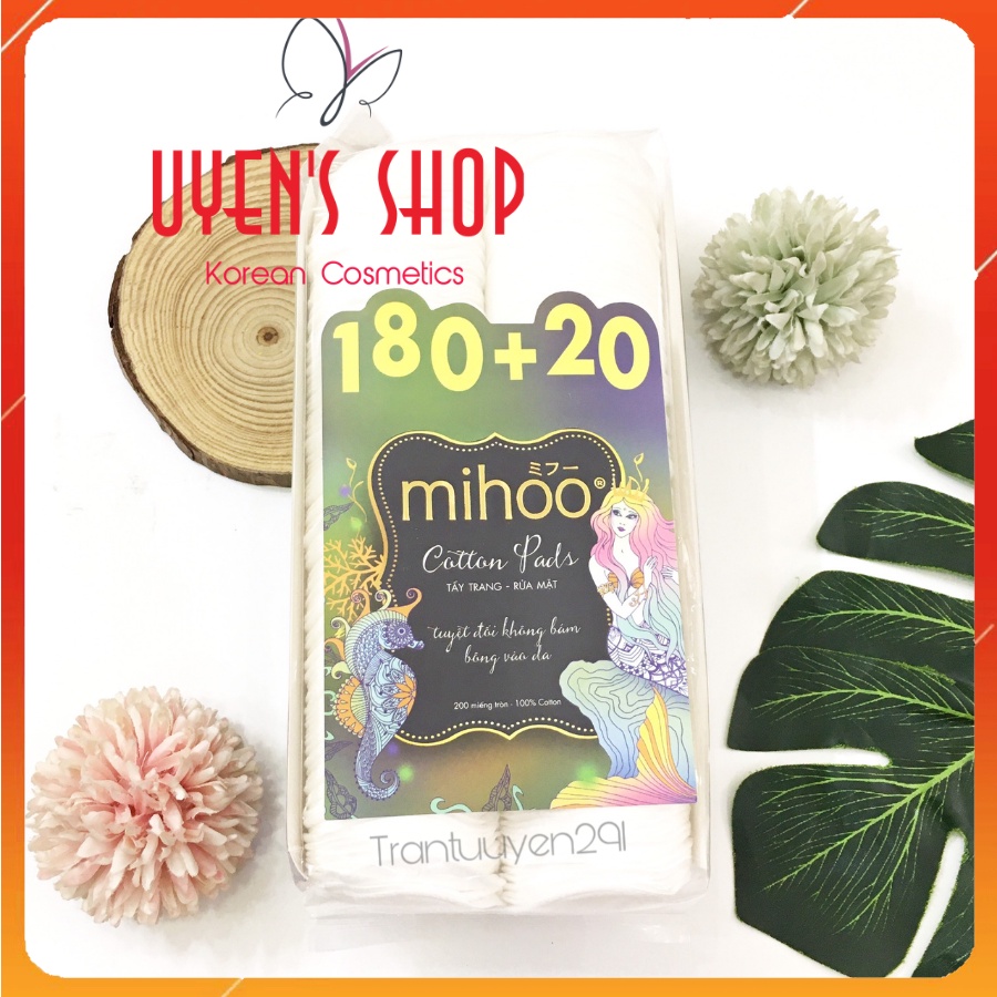 💥Bông tẩy trang nàng tiên cá Mihoo 180+20 Cotton Pad Công dụng - Giúp làm sạch lớp trang điểm trên da mặt như phấn, son.. - Giúp lau sạch lớp bã nhờn, bụi bẩn, tế bào chết, giúp làm sạch lỗ chân lông cho làn da thoáng mịn. - Miếng bông có 2 mặt giúp tận dụng tối đa sản phẩm. - Sợi bông mềm mịn thấm hút tốt dung dịch, nhẹ nhàng làm sạch da mà không để lại sơ bông trên mặt. Thành phần chính - 100% bông cotton - Sản phẩm không có chứa chất huỳnh quang và chất thơm. Hướng dẫn sử dụng - Khi dưỡng da: Tẩm nước hoa hồng lên miếng bông rồi sử dụng Khi tẩy trang (có 2 cách tẩy trang): +Dùng dung dịch tẩy trang Massage mặt, sau đó sử dụng bông tẩy trang lau sạch +Thấm dung dịch tẩy trang lên bông, sau đó dùng bông lau những vùng da cần tẩy trang