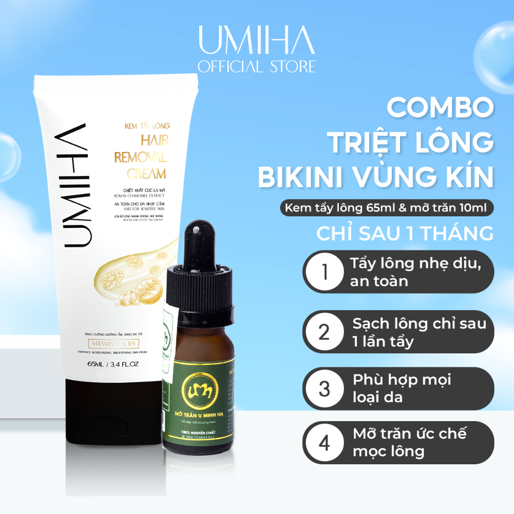 Giới thiệu Tẩy Triệt Lông Vùng Kín Bikini Vĩnh Viễn Umiha - Combo Mỡ Trăn Triệt Lông U Minh Hạ (10ML) Kem Tẩy Lông Umiha (65ML)