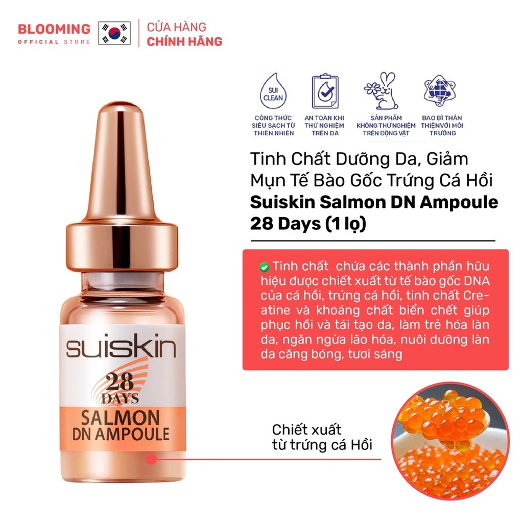 Tinh chất dưỡng phù hợp với cấu trúc của mọi loại da, đặc biệt là làn da nhạy cảm và đạt hiệu quả cao trong việc điều ngừa các vấn đề về da như: da mụn, nám, da tổn thương, da lão hóa, là dòng mỹ phẩm cao cấp trong đặc ngừa vấn đề về mụn và chăm sóc làn da sau mụn. +Là siêu phẩm đặc ngừa mụn và chống lão hóa da chiết xuất từ trứng cá hồi tươi +Thu nhỏ lỗ chân lông, Ngăn ngừa và ngừa mụn hiệu quả +Làm trẻ hoá da, ngăn ngừa lão hóa. Làm căng bóng và sáng da tức thì +Phục hồi, tái tạo da hư tổn, tăng độ đàn hồi da. Kiểm soát dầu, ngăn ngừa mụn + Phục hồi, tái tạo sau các tổn_thương do mụn, nám, tàn nhang, lão hóa, dị ứng, da khô sần… HDSD : - Sử dụng ngày 2 lần, hiêu quả nhất là vào buổi tối. - Sau bước rửa mặt lấy tinh chất suiskin salmon dn ampoule 28 days thấm đều lên da và Massage nhẹ nhàng để tinh chất thấm sâu vào bên trong tế bào da.