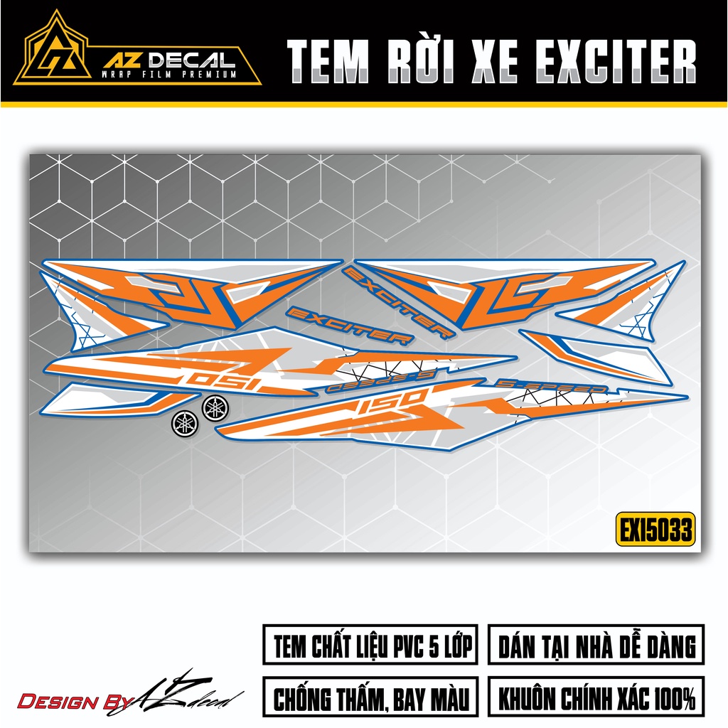 * THÔNG TIN SẢN PHẨM TEM RỜI XE YAMAHA EXCITER 150 - Chất liệu decal PVC chống thấm nước, chống phai màu - Bám dính chắc chắn, cắt khuôn sẵn dễ dán, bóc tem không ảnh hưởng sơn xe - Công nghệ in Eco-Solvent cho màu tem bắt mắt, sắc nét từng chi tiết - Tem có 2 lựa chọn màu sắc, Quý khách vui lòng chọn màu tem tương ứng với màu xe như ảnh minh hoạ. - Sản phẩm được sản xuất tại Việt Nam