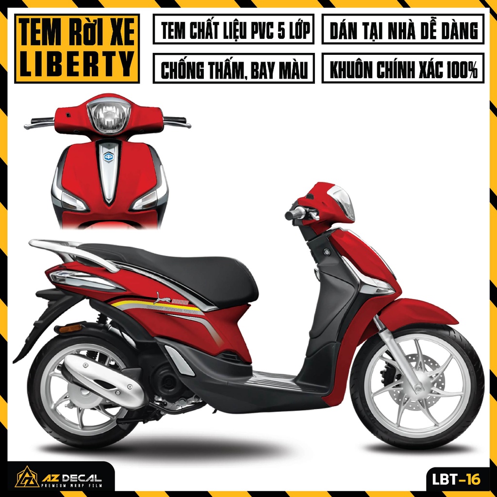 * THÔNG TIN SẢN PHẨM TEM RỜI XE LIBERTY - Chất liệu decal PVC chống thấm nước, chống phai màu - Bám dính chắc chắn, cắt khuôn sẵn dễ dán, bóc tem không ảnh hưởng sơn xe - Công nghệ in Eco-Solvent cho màu tem bắt mắt, sắc nét từng chi tiết - Quý khách vui lòng chọn màu tem tương ứng với màu xe như ảnh minh hoạ. - Sản phẩm được sản xuất tại Việt Nam