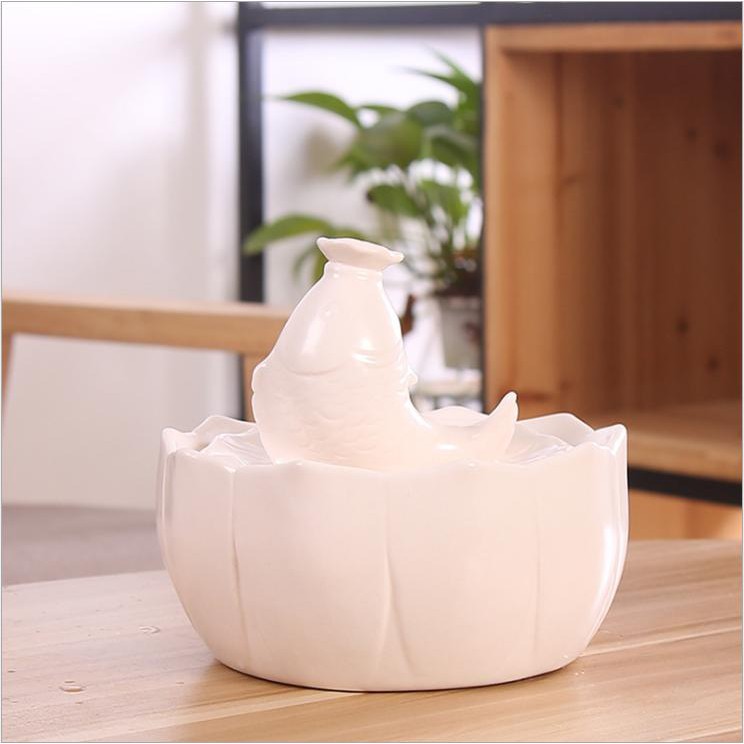 Thác Nước Phong Thủy Hoa Sen Trắng Và Song Ngư Cá chép được biết đến như một pháp khí giúp kích tài lộc và công danh. Cá chép thuộc hành Thủy chính vì vậy các vật phẩm có hình ảnh cá chép có Thủy khí rất mạnh và rất hợp với những người thuộc mệnh Thủy và Mộc sẽ cầu tài lộc, may mắn. Hoa sen là biểu tượng cho sự dư giả, giàu có, thanh cao, mong ước được một cuộc sống no đủ và viên mãn. Song ngư liên hoa luôn được mọi người yêu thích bởi nó mang ý nghĩa phong thủy sâu sắc về tiền tài, bình an, kiên trì, bền chí và danh vọng cho gia chủ. Kích thước : 17cm x 21cm Chất Liệu : Gốm Sứ Sản phẩm gồm 1 máy bơm mini kèm theo