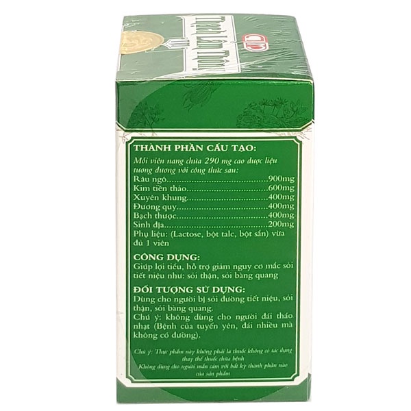 · Thông tin mô tả sản phẩm là hoàn toàn chính xác với công bố sản phẩm đã đăng ký với Bộ Y tế, 100% sản phẩm đều có giấy phép lưu hành từ Bộ y tế · Cam kết tất cả các sản phẩm cung cấp cho Quý khách hàng đều mới 100%, có nhãn hiệu và xuất xứ rõ ràng. _x000D_ THÀNH PHẦN THẠCH LÂM THÔNG TM: Mỗi viên nang chứa 290mg cao dược liệu tương đương với công thức sau: Râu ngô:…………………………………….900mg Kim tiền thảo:………………………………..60mg Xuyên khung:……………………………..400mg Đương quy:………………………………..400mg Bạch thược:……………………………….400mg Sinh địa:……………………………………200mg Phụ liệu: Lactose, bột talc, bột sắn vừa đủ 1 viên