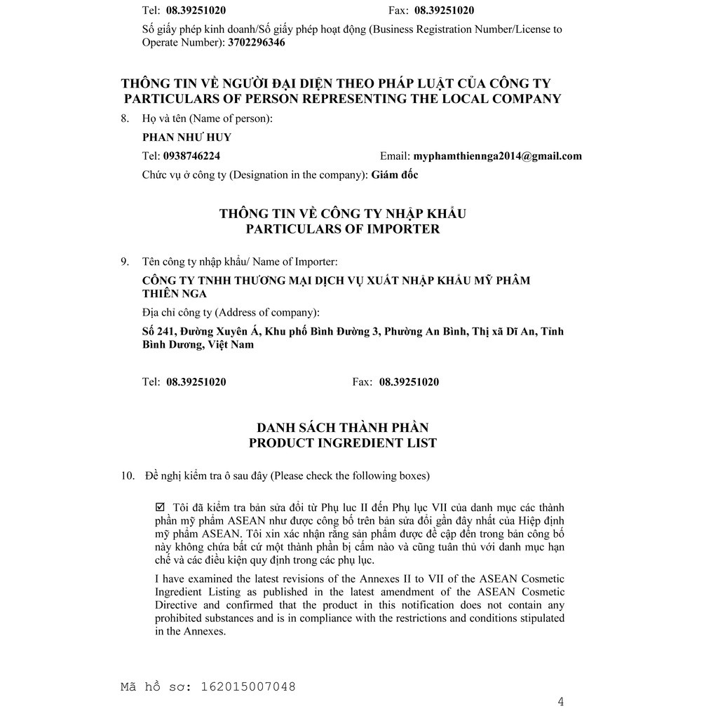 Thành phần chính (Ingredients) Purified Water, Tranexamic Acid, Glycolic Acid, Propylene Glycol, Xanthan Gum, Maltodextrin, Triethanolamine, Licorice Extract, Methylparaben, Fragrance