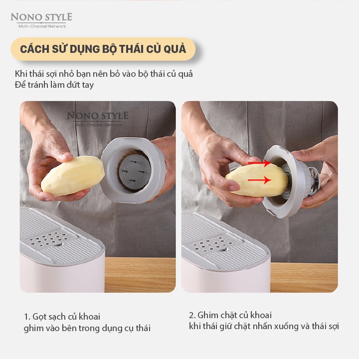 ☑️ Hướng Dẫn Sử Dụng Rau củ quả khi muốn thái sợi nhỏ tốt nhất nên sử dụng Bộ Thái Rau Củ Đa Năng Ecoco để tránh làm đứt tay. Thành phẩm có ngay chỉ với 2 bước đơn giản: Bước 1: Gọt sạch củ khoai rồi ghim vào bên trong dụng cụ thái. Bước 2: Ghim chặt củ khoai giữ chặt nhấn xuống và bắt đầu thái.
