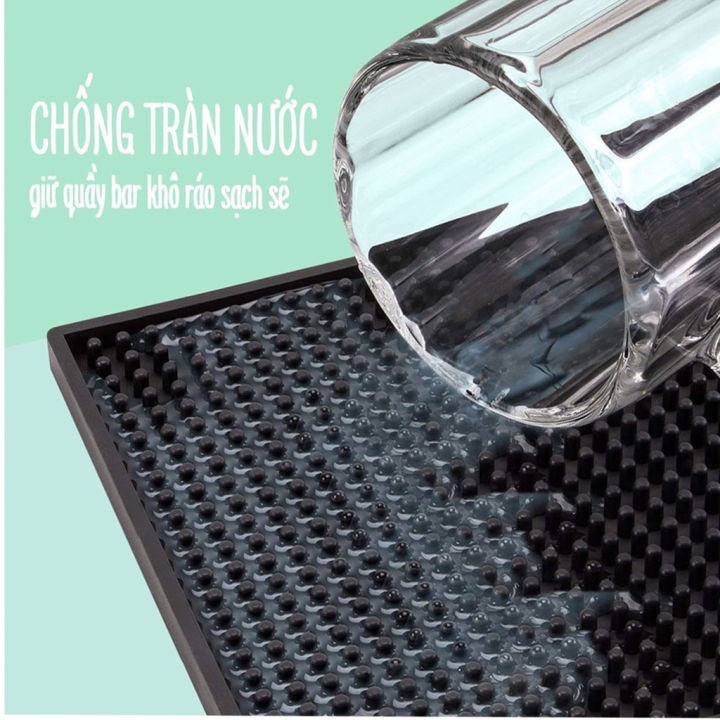 Thảm bar pha chế lót sàn bằng cao su - Miếng lót cao su silicon quầy bar đa năng có thể dùng làm bàn trà Thông số kỹ thuật thảm bar pha chế cao su Chất liệu : cao su Kích thước : 45 cm x 30 cm, hoặc 30cm x 15cm, Dày: 0.9 cm Màu sắc: Đen Công dụng thảm bar pha chế làm bằng cao su dùng làm bàn trà - Những chiếc gai cao su nổi lên giúp giữ những chiếc ly thủy tinh ở đúng chỗ - Ngăn chặn việc đổ tràn thức uống từ ly, giúp ly thức uống không bị ướt át - Cắt giảm thời gian làm sạch ly tách của bạn, giúp những ly tách khô mau hơn bằng cách giữ chúng cao hơn phần nước nhỏ xuống. - Dễ dàng vệ sinh, rửa sạch bằng nước ấm và xà bông, sau đó để nơi khô ráo - Giữ bề mặt quầy bar của bạn và những chiếc ly thủy tinh không bị trầy xước - Chống ẩm cho bề mặt bàn.