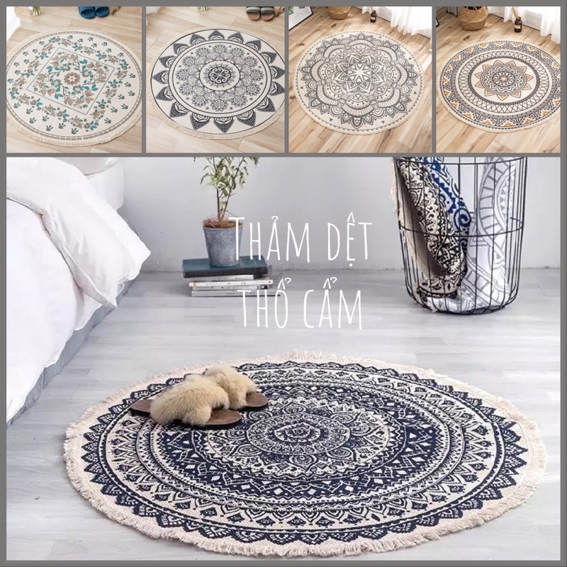 Thảm chùi chân- Thảm tròn- Thảm trang trí nhà cửa- Thảm cửa- Thảm thổ cẩm Thảm tròn trang trí nhà cửa được dệt hoàn toàn thủ công bằng sợi vải cotton tự nhiên, công nghệ nhuộm hoàn toàn bằng chất nhuộm nguồn gốc thực vật, đảm bảo vệ sinh và an toàn trong sử dụng