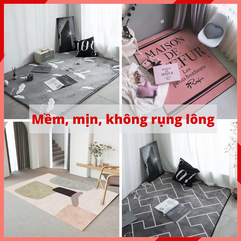 Thông tin sản phẩm thảm trải sàn nỉ lì nhung Có 3 lớp: - Chất liệu bề mặt nỉ lì nhung rất mềm, mượt. Chỉ cần chạm vào bất kể bộ phận nào trên cơ thể bạn cũng rất thích luôn. - Lớp ở giữa là lớp bông xốp tạo cảm giác êm ái - Lớp cuối cùng là đế cao su chống trơn khỏi mặt sàn và phẳng lì xuống mặt sàn Đặc biệt là tuyệt đối an toàn với trẻ nhỏ. Thảm rất nhẹ và dễ dàng vệ sinh khi cần Họa tiết 5D sang trọng giúp cho căn phòng của bạn trở lên đẹp hơn bao giờ hết + Size: 150x190cm, 100x160, 40x60 + Có túi đựng sang trọng