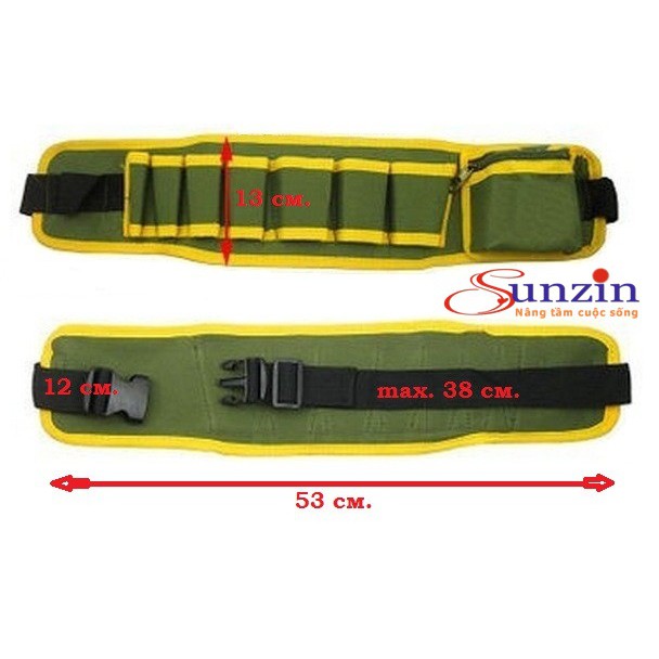 Túi đeo thắt lưng Sunzin 177 là loại túi đeo chuyên dụng để chứa các thiết bị, đồ nghề của bạn. Đây là thiết bị rất có ích với các người công nhân, người thợ có nhiều đồ nghề phải thường xuyên di chuyển Túi đeo thắt lưng đựng đồ nghề 9 ngăn Sunzin 177 được làm từ chất liệu polyeste tổng hợp vô cùng chắc chắn, có độ bền tuyệt đối, thách thức cả thời gian. Túi có những đường chỉ được gia công chắc chắn, rất khó bị rách. Túi có các thiết kế đến 9 ngăn phù hợp cho từng loại thiết bị, được thiết kế một cách rất khoa học để bạn sắp xếp và lấy dụng cụ ra thật dễ dàng. Quai đeo của túi được gia công đặc biệt chắc chắn, giúp bạn đeo túi một cách chắc chắn mà không lo bị rách.