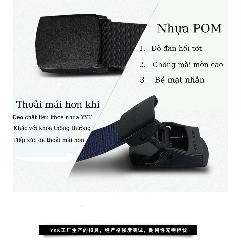 ✅ ƯU ĐIỂM SẢN PHẨM: • Chiều dài gồm khóa 120 cm. Bản dây rộng 3.8cm. • Mặt khóa bằng nhựa POM có độ bền cơ học cao, chịu va đập tốt, chịu hóa chất. • Bản thắt lưng phù hợp với nhiều loại đỉa quần (quần tây, đồng phục, Jeans, Kaki). • Khóa kẹp có thể vừa với các size bụng khác nhau mà không cần đục lỗ trên dây. • Thoải mái ngay cả khi vận động, có cảm giác tự do giống như là không đeo thắt lưng. • Khóa kẹp có thể vừa với các size bụng khác nhau mà không cần đục lỗ trên dây. • Thắt Lưng Vải Dù Khóa Nhựa chắc chắn, không sổ lông, bền chặt theo thời gian.