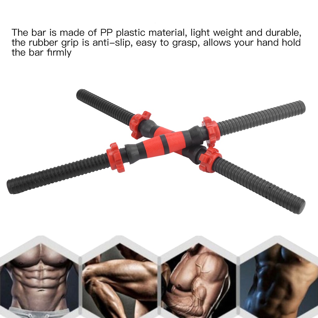 Feature: 1. The bar is made of PP plastic material, light weight and durable, the rubber grip is anti‑slip, easy to grasp, allows your hand hold the bar firmly. 2. Dumbbell bar can be used to create various exercise modes to customize exercise intense. 3. It can be used with dumbbells and fixed by star‑shaped lock nut to prevent slipping during exercise. 4. Suitable for various warm‑up exercises and strength training, such as arms, shoulders, abdominal muscles, legs or back training. 5. This pair of weights dumbbells bar set can help you do weight lifitng training at home.