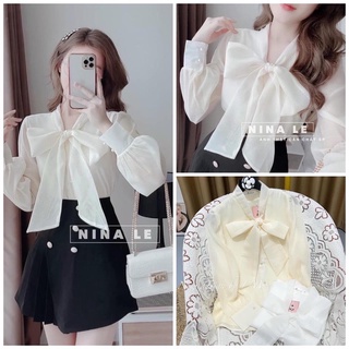 [Ảnh thật/Video] Áo sơ mi Lazy thiết kế tay bồng cổ nơ khuy ngọc tiểu thư Áo trắng công sở nhẹ nhàng