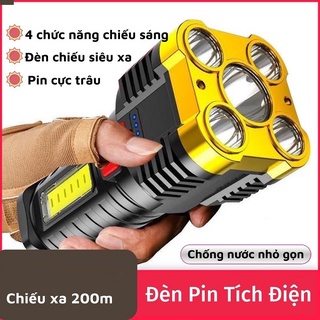 Đèn pin siêu sáng cầm tay 5 bóng chiếu xa 200m, chống thấm nước 4 chế độ sáng, đèn pin Led sạc tích điện