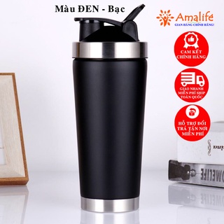 [Màu ĐEN Bạc] Bình Lắc Shaker Đựng Nước Inox 800ml – Màu Đen Bạc - Tập Gym Thể Thao Chính Hãng Amalife – Kèm Bóng Lò Xo