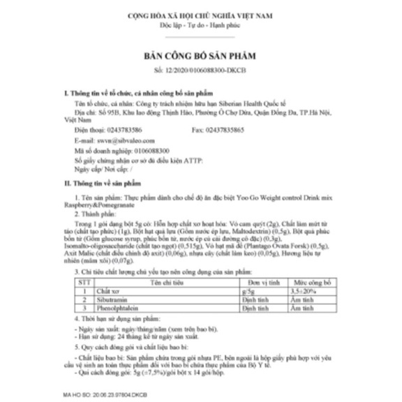 Thành phần: Trong 1 gói dạng bột 5g có: Hỗn vật chất xơ hoạt hóa: Vỏ cam quýt (2g), Chất làm mứt từ táo (chất tạo phức) (1g), Bột hạt quả lựu (Gồm sinh tố lựu, Maltodextrin) (0,5g), Bột quả phúc bồn tử (Gồm glucose syrup, phúc bồn tử, sinh tố củ cải đường cô đặc) (0,3g), Isomalto-oligosaccharide (chất tạo ngọt) (0,515g), Vỏ hạt mã đề (Plantago Ovata Forsk) (0,5g), Axit Malic (chất thay đổi độ axit) (0,06g), nhựa cây (chất làm keo) (0,05g), nguyên liệu đương nhiên (mâm xôi) (0,07g). Miêu tả Sản phẩm là nguồn trưng bày chất xơ ngẫu nhiên từ hoa trái như: vỏ cam quýt, mứt táo, bột hạt quả lựu, bột quả phúc bồn tử, vỏ hạt mã đề... có công dụng tương trợ cải tiến chất xơ, tương trợ giảm hiệu ứng thèm ăn. Hương phúc bồn tử ngẫu nhiên giúp đưa tới mùi vị thơm ngon, dễ uống. Bảo quản: lưu lại nơi khô ráo, thoáng mát, tránh năng lượng và ở nhiệt không thật 25°C Cách sử dụng Hướng dẫn sử dụng: tổng hợp vào cốc chứa 100-150ml nước, dùng ngay sau thời điểm khuấy đều. Uống 1 lần hàng ngày vào sáng sớm một phần hai tiếng trước lúc ăn. Đối tượng sử dụng: người trưởng thành bị bị thừa cân hoặc người cần làm chủ cân nặng Xuất xứ: Liên Bang Nga Thương nhân nhập vào và chịu nhiệm vụ về chất lượng đảm bảo sản phẩm: CÔNG TY TNHH SIBERIAN HEALTH QUỐC TẾ Địa chỉ: Tầng 2, căn nhà HH-N01 Gold Season, 47 Nguyễn Tuân, Phường TX Thanh Xuân Trung, Quận Thanh Xuân, tỉnh thành Hà Nội, Việt Nam. Điện thoại: 0393109468