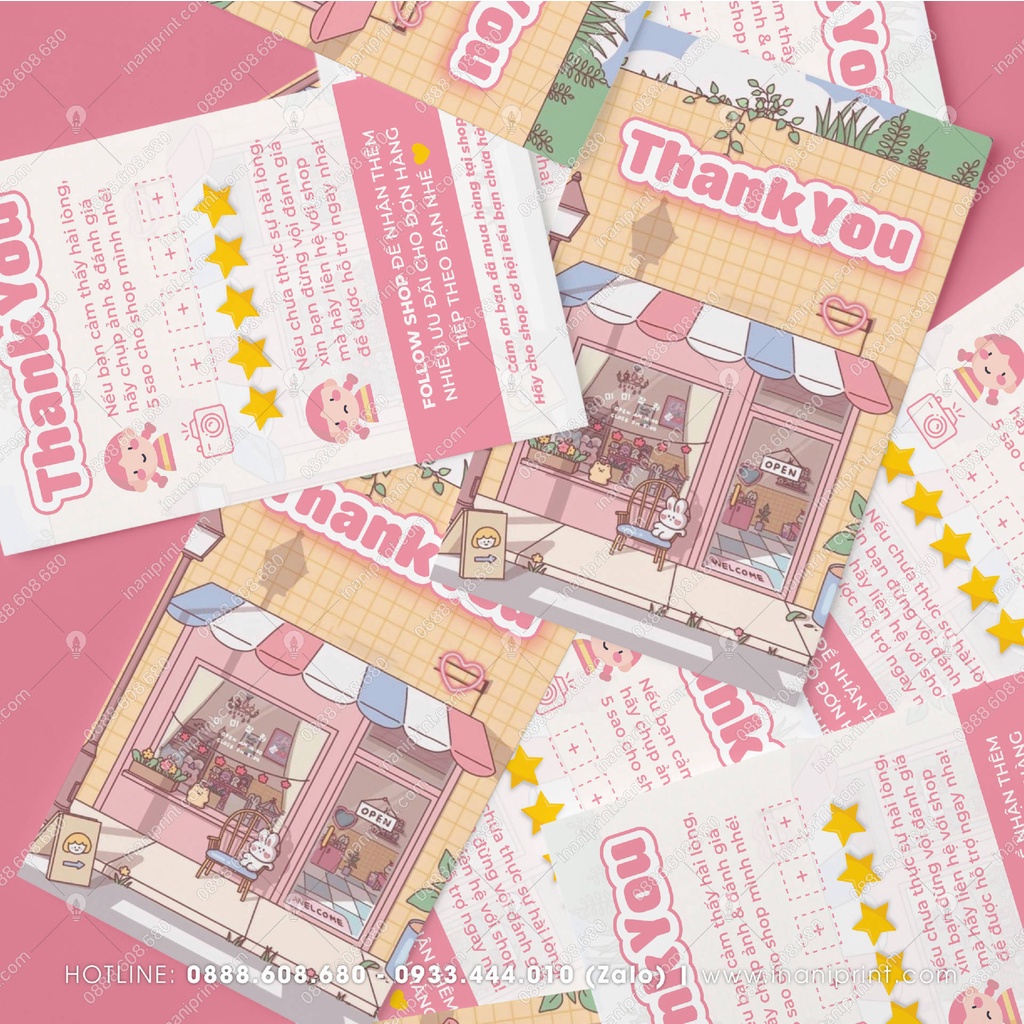 🔔 Shop có FREESHIP EXTRA, Khách mua đủ số tiền để nhận ưu đãi ship nhé ◼️ Miễn phí vận chuyển tối đa 20K cho đơn hàng từ 50K. ◼️ Miễn phí vận chuyển tối đa 70K cho đơn hàng từ 300K. Khách hàng mua số lượng từ 500 tấm trở lên hãy inbox shop để nhận mã giảm giá nhé. ==================== ✅THÔNG TIN SẢN PHẨM ◼️ Kích thước card : 9x5.4cm ◼️ Chất liệu: Giấy C300 dày dặn ◼️ Quy cách : In 2 mặt và Cán Màng mờ 2 mặt chống nước ◼️ Kỹ thuật in offset sắc nét ==================== ✅CÔNG DỤNG ◼️ Tạo ấn tượng với khách hàng ◼️ Thay lời cảm ơn của shop đến với khách hàng ◼️ Tăng tỉ lệ đánh giá 5 sao cho sản phẩm ◼️ Những đơn hàng lỗi sẽ không bị đánh giá kém mà sẽ liên hệ với shop để giải quyết ◼️ Giúp shop xây dựng hình ảnh chuyên nghiệp. ==================== ✅IN ẤN IPRINT CAM KẾT ◼️ Sản phẩm giống như clip và hình ảnh mô tả ◼️ Hàng sẳn và mới 100% khách lên đơn giao ngay ◼️ Sản phẩm được đựng trong bịch kiếng và có giấy thơm ◼️ In Ấn iPrint cam kết giải quyết mọi vấn đề xảy ra khi khách hàng không hài lòng. ==================== 🔴 Shop cần in thông tin hoặc thiết kế theo yêu cầu vui lòng liên hệ Z.a.l.o: 0862268688 =================== Công ty Thiết Kế và In Ấn iPrint • Hotline : 0933.444.010 - 0888.608.680 • Email: inaniprint@gmail.com • Facebook: www.facebook.com/inaniprint • Website: www.inaniprint.com • Địa chỉ: 16 Bà Hạt, Phường 9, Quận 10, Thành Phố Hồ Chí Minh.