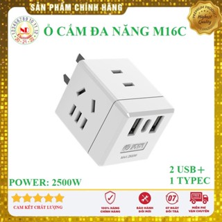 Ổ Cắm Điện Cube Đa Năng M16C, Ổ Cắm Chuyển Đổi 3 Chân Chéo, Gồm 2 Cổng Sạc USB 5V/2.4A, 1 Cổng Sạc Type C