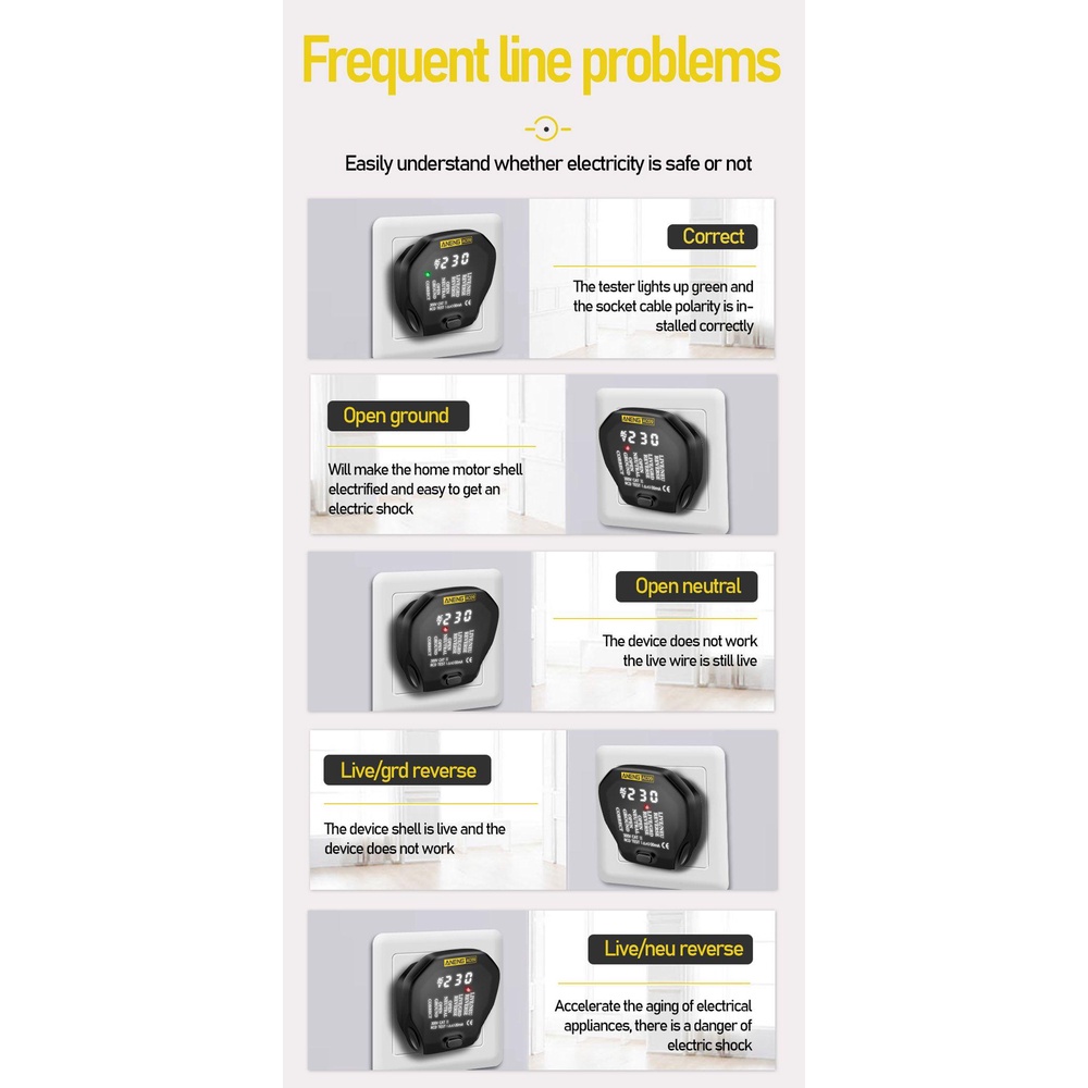 Aneng AC09socket tester chủ yếu được sử dụng để phát hiện cực tính của hệ thống dây điện ổ cắm điện và sự an toàn của các công tắc rò rỉ . Nó có thể phát hiện nhanh chóng và chính xác hệ thống dây điện của ổ cắm . Máy kiểm tra có màn hình hiển thị cũng có thể đo điện áp của ổ cắm và hiển thị nó .