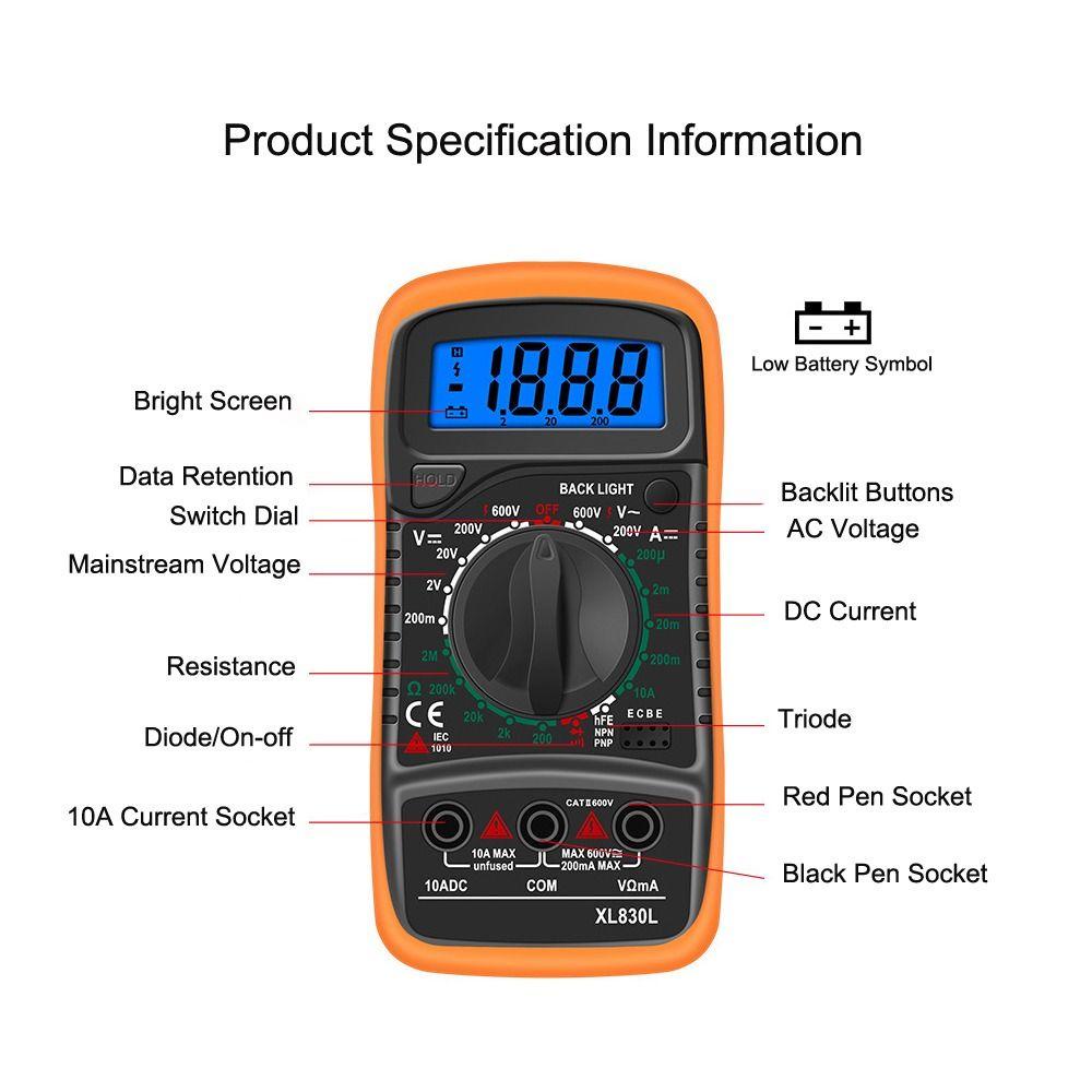 Vui lòng cho phép sự khác biệt kích thước nhỏ do đo lường thủ công khác nhau . Đồng hồ vạn năng kỹ thuật số Máy đo điện dung đametro Máy đo điện áp hiện tại Máy đo điện áp Máy đo điện áp Ampe kế Máy đo điện áp Máy đo dòng điện Công cụ thợ điện Đèn nền LCD cầm tay AC-DC XL830L